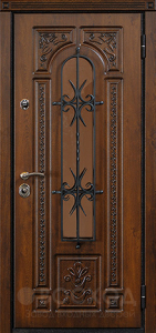 Стальная основа из профильной трубы и лист металла толщиной 2 мм обеспечивает надежность конструкции, а ребра жесткости усиливают её устойчивость к нагрузкам. Входная дверь для коттеджа №7 облицована панелями из натурального дерева, благодаря чему она сочетает в себе прочность металла и теплоту древесных оттенков. Такая отделка выглядит престижно и органично вписывается в архитектуру загородного дома, при этом устойчива к царапинам и долговременно сохраняет привлекательный вид. Два контура уплотнителей из резины обеспечивают плотное прилегание полотна и защищают от сквозняков. Для большего комфорта можно дополнить дверь утеплителем из минваты или пенопласта, что сделает её энергоэффективной и более комфортной в использовании в холодное время года. Массивный внешний облик в сочетании с продуманной конструкцией превращает эту модель в достойное решение для входной группы коттеджа.