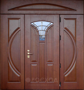 Входная дверь двойная в частный дом №94 создана для просторных проемов и подчеркивает архитектурную выразительность коттеджа. Двустворчатая конструкция на основе стального листа толщиной 2 мм и усиленных профильных труб обеспечивает надежную защиту и жесткость, а блокираторы препятствуют снятию полотна. Натуральное дерево в отделке с обеих сторон придает двери благородный вид, создавая гармонию между массивной основой и теплым внешним обликом. Такой материал устойчив к механическим повреждениям, сохраняет привлекательность при эксплуатации и органично смотрится в интерьере частного дома. Два контура уплотнения защищают от сквозняков, а при необходимости дверь можно утеплить минеральной плитой или пенопластом. Двойная конструкция не только удобна в использовании, но и смотрится солидно, подчеркивая статус и надежность жилища.